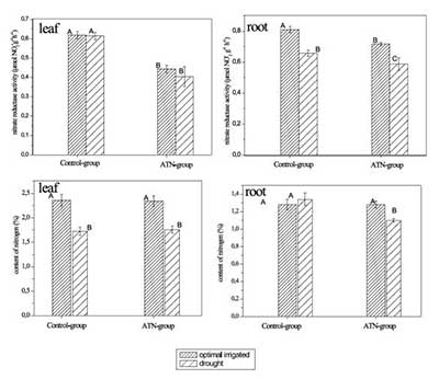 硝酸還原酶(NR)活性水平和兩個(gè)組(活性炭和對照)的葉和根中的氮含量如圖2所示。這些結(jié)果表明干旱條件誘導(dǎo)了兩個(gè)組(對照和活性炭組)的根中的硝酸還原酶活性的顯著降低,以及活性炭混合物組根部中的N吸收降低。