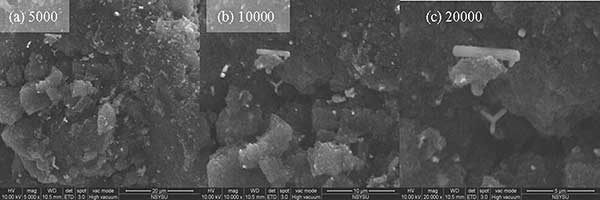 硫浸漬活性炭由大量微孔組成,高硫含量增強了活性炭對氯化汞的吸附能力。微孔通常具有大部分HgCl2吸附的活性位點,而大孔和中孔作為運輸路線。圖21顯示了分別放大5000,10,000和20,000倍的硫浸漬活性炭的ESEM圖像。如圖1所示,主要在活性炭表面發(fā)現(xiàn)大于500的大孔,中孔和微孔隱藏在活性炭內部。在硫浸漬之后,硫分子可以擴散并沉積在活性炭的微孔上,并且可能堵塞過渡路徑。
