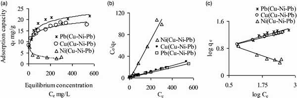 金屬離子作為路易斯酸的性質(zhì)可以證明金屬物質(zhì)與生命系統(tǒng)和活性炭吸附劑的相互作用。因此,通過其路易斯酸度對金屬進行分類將在其修復方法中保持一致。這種類型的分類基于它們觀察到的對不同配體的親和力將金屬分為三類,如(a)類“硬金屬”,(b)類“軟金屬”或類(c)邊界“難以區(qū)分為硬或軟”。通過在含有Cu(II),Ni(II)和Pb(II)三元溶質(zhì)的溶液中的吸附,研究了邊界和軟陽離子之間的競爭效應(yīng)。圖2顯示了Cu(II),Ni(II)和Pb(II)的Langmuir(a和b)和Freundlich(c)吸附等溫線,而它們的初始濃度在三元溶液中從<25到≤600mgL變化-1和初始pH保持恒定在5.由于單個Cu(II)吸附是在不同的初始濃度<5至<120mg L-1下進行的,并且通過制備的活性炭對初始濃度沒有發(fā)現(xiàn)可檢測的殘留濃度通過構(gòu)建圖1(a)和1(b)中提到的相同濃度范圍的Langmuir等溫線,研究了5mg L-1的競爭離子的影響。這些等溫線的模型參數(shù),對于Langmuir曲線擬合,r2值通常更高。