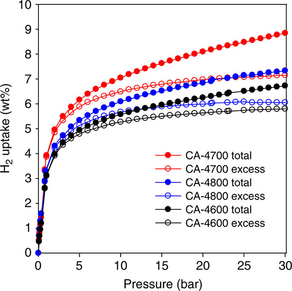 活性炭中的氫儲(chǔ)存需要具有最高表面積和適當(dāng)尺寸的孔的材料。在-196和25℃下使用重量法在HidenXEMIS分析儀上在0-30巴的壓力范圍內(nèi)研究活性炭的儲(chǔ)氫能力。圖2顯示了活性炭在-196℃下的過(guò)量和總氫吸收等溫線。對(duì)于所有CA-4T活性炭,氫吸收是可逆的,沒(méi)有滯后現(xiàn)象,并且在0-30巴的壓力范圍內(nèi)沒(méi)有達(dá)到飽和。我們首先注意到1巴的氫吸收非常令人印象深刻,在3.1-3.9wt%的范圍內(nèi)。這種儲(chǔ)氫比為高表面積活性炭?jī)A向于在2-3重量%范圍內(nèi)的任何報(bào)告的值高得多。我們將這種特別高的吸收特性歸因于非常高的微孔表面積和富氧表面的組合,特別是對(duì)于3.9重量%的活性炭樣品CA-4700。富氧表面的效果是對(duì)于活性炭樣品CA-4600,其盡管具有適度總表面積和微孔表面,仍然表現(xiàn)出的吸收比以前發(fā)現(xiàn)的活性炭材料具有高得多的表面積。經(jīng)過(guò)研究發(fā)現(xiàn),具有氧官能團(tuán)的活性炭效果預(yù)期在低壓下具有最大效果,其中氫和表面之間的相互作用比在較高壓力下更重要,其中通過(guò)空間填充機(jī)制更可能發(fā)生氫吸收。