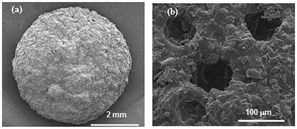 圖1.(a)珠粒尺寸和(b)活性炭明膠復合材料外表面的SEM照片。