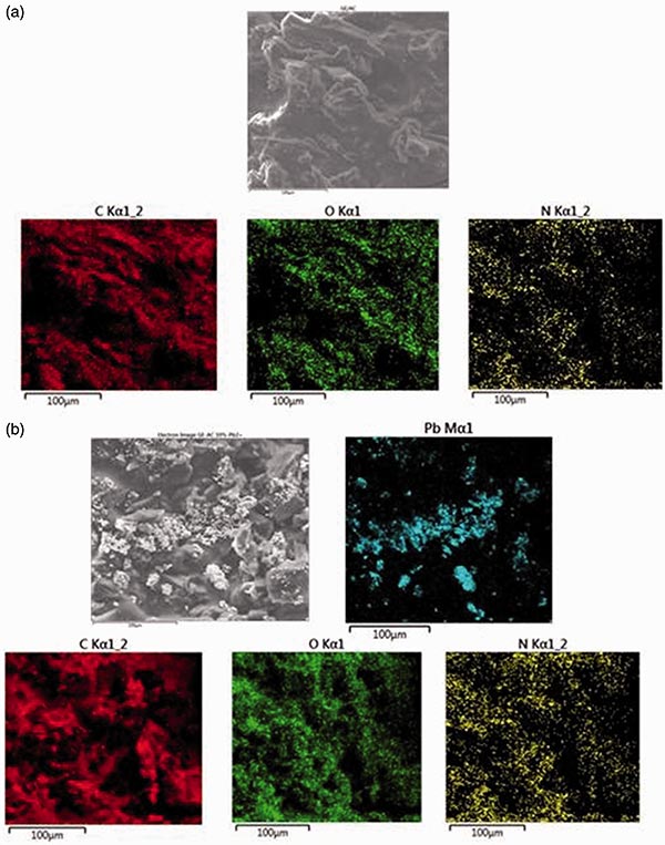 圖2.吸附鉛離子之前和(b)活性炭明膠復合材料吸附之后(a)的EDX點映射。