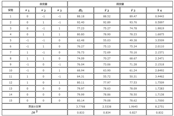 圖1示出了一組測定的實(shí)驗(yàn)條件(表示為編碼變量)和因變量所獲得的實(shí)驗(yàn)數(shù)據(jù)y1-y4,以及有關(guān)廢水的顏色化合物的參數(shù),與活性炭處理前的參數(shù)。