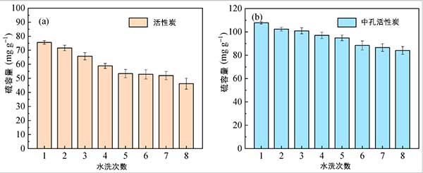 為了比較水洗再生對脫硫后活性炭樣品的影響,研究了硫容量與活性炭和中孔活性炭的循環(huán)次數,如圖3所示;钚蕴康墓ぷ髁蛉萘靠傮w呈下降趨勢,第一次脫硫時為75.6 mg·g-1,第8次循環(huán)為46.2 mg·g-1,減少率為40.5%,如下圖所示。圖3a。結果表明,飽和吸附劑對H 2 SO 4的不完全解吸對循環(huán)SO 2有明顯的負面影響活性炭的吸附性能。用中孔活性炭觀察到類似的結果。然而,中孔活性炭的硫容量在8個循環(huán)后降低了22.0%,遠低于微孔活性炭的降低速率,這表明互連微孔和有序介孔的特性促進了H的解吸。2 SO 4并減少硫容量的減少。