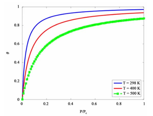 下圖(圖1)顯示了加載分數(shù)θ與氣體壓力P/P0在不同溫度之間的定量關(guān)系。BET方程是模擬活性炭上氣體吸附動力學的好方法,但它僅適用用于單組分氣體吸附。在下面的部分中,介紹了多組分油蒸氣回收的綜合模型。