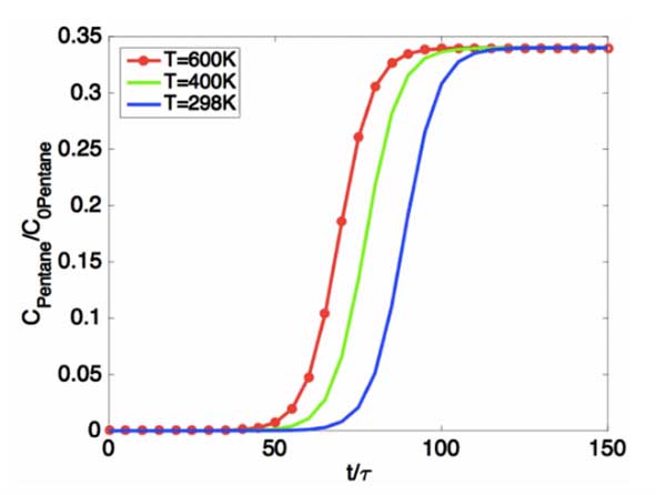 結(jié)果與討論我們已經(jīng)提出了一個綜合模型,該模型定量地預測了填充床反應器中油蒸氣回收的吸附動力學。在該模型中,我們僅考慮軸向擴散,并使用質(zhì)量守恒方程來模擬油氣吸附的時空分布。我們假設活性炭吸附在恒溫下操作,并且與活性炭的吸附容量相比,油蒸氣濃度非常低。此外,假設油蒸氣中的組分之間不發(fā)生化學反應,因此每種組分可以作為獨立的吸附物處理。因此,多組分吸附問題可以轉(zhuǎn)化為單組分吸附問題。下圖(圖2)說明了吸附動力學的溫度依賴性。