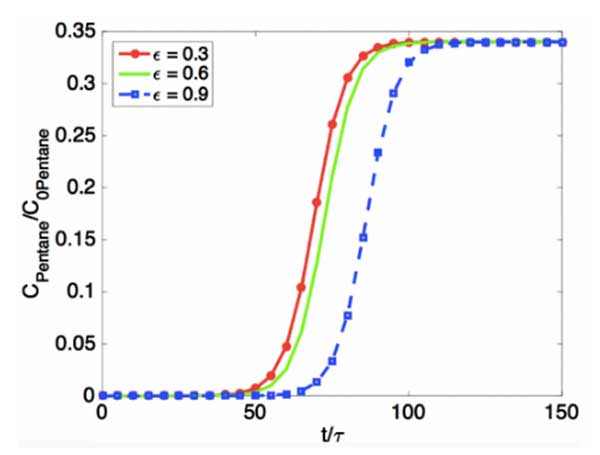 模擬三種不同孔隙率的活性炭的吸附動力學(圖2)。通過多組分加權(quán)平均計算C/C0(我們模擬每種組分的吸附動力學,計算它們相應的穿透曲線,并根據(jù)它們在原始油蒸氣中的體積分數(shù)得出加權(quán)平均值)。從圖3中可以看出,較高的孔隙率可以在較長的穿透時間內(nèi)重新產(chǎn)生,這與較高的孔隙率將導致較高的表面積并且將使反應器中的吸附物的停留時間更長的事實一致。