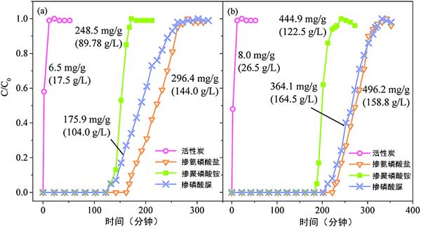 活性炭對(duì)甲苯的穿透曲線以及吸附容量如圖2所示。沒摻氮的活性炭表現(xiàn)出較差的甲苯吸附性能,吸附容量分別為6.5和8.0mg g-1。與摻氮活性炭相比,添加含氮磷酸鹽的活性炭需要更長的時(shí)間才能接近突破并表現(xiàn)出更高的吸附能力。對(duì)于在600℃下制備的活性炭,其經(jīng)含氮磷酸鹽處理的活性炭的突破時(shí)間為氨磷酸鹽活性炭>磷酸脲活性炭>聚磷酸銨活性炭,其相應(yīng)的體積吸附容量為144.0,104.0和89.8g L-1,質(zhì)量吸附容量分別為296.4,175.9和245.8 mg g-1,分別。與600℃相比,900℃制備的活性炭具有更高的甲苯吸收量,體積吸附容量為122.5-164.5g L -1,質(zhì)量吸附容量為364.1~496.2 mg g-1。值得注意的是,可以看出氨磷酸鹽處理的活性炭具有較高的質(zhì)量吸附能力,而磷酸脲處理的活性炭具有較高的體積吸附能力。這可能歸因于它們不同的堆積密度,氨磷酸鹽具有比磷酸脲更高的堆積密度。