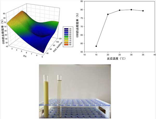 在絮凝實驗中,pH值,絮凝劑添加量和反應(yīng)溫度是影響COD去除率的主要因素。為了確定切削液廢物處理影響的因素和相互作用,進行了響應(yīng)面分析。不同活性炭濃度和改變pH和反應(yīng)溫度對COD去除速率的影響的響應(yīng)面分別如圖2a,b所示。絮凝前后切削液水樣的比較如圖2c所示。