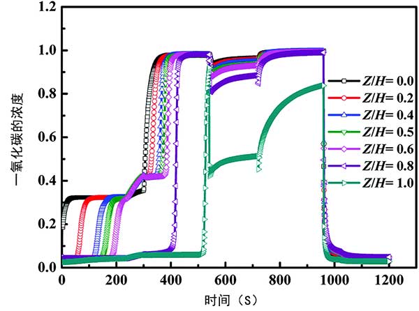 循環(huán)中活性炭床1上軸向CO濃度的變化在圖3顯示。在標(biāo)記為Z/H的吸附床中精確定位7個(gè)測(cè)量點(diǎn),分別為0.00,0.20,0.40,0.50,0.60,0.80和1.00,Z/H=0.00定義為吸附床的入口。從圖3中可以看出,在吸附步驟之后,吸附床處于Z/H=0.00-0.60達(dá)到CO吸附的飽和度。在ED步驟期間,一些雜質(zhì)氣體從吸附床排出,并且CO濃度略微增加。在更換步驟中,吸附床中的CO濃度逐漸增加,并且在更換步驟后,吸附床中的CO濃度高于98%,除了床出口,即在更換步驟結(jié)束時(shí),吸附床在Z/H=1.00時(shí),CO吸附飽和。因此,活性炭在合適條件下被充分利用。
