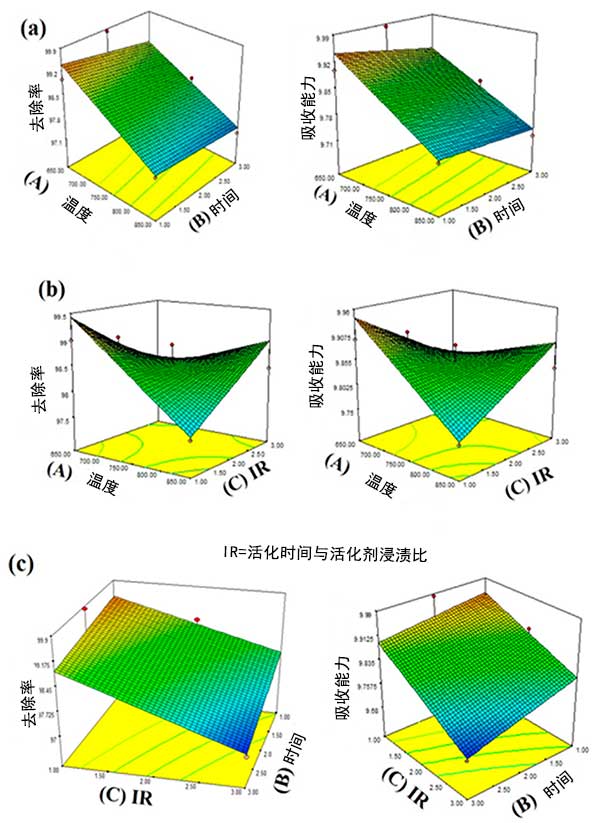 圖1:活性炭的(a)活化溫度和浸漬比(b)活化溫度和活化時(shí)間(c)浸漬比和活化時(shí)間,去除率和吸附能力對表面響應(yīng)曲線的影響。