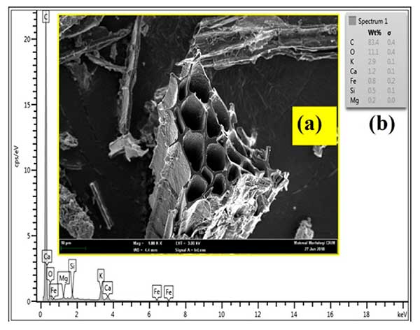 圖2:(a)FESEM圖像和(b)活性炭的EDX圖譜。