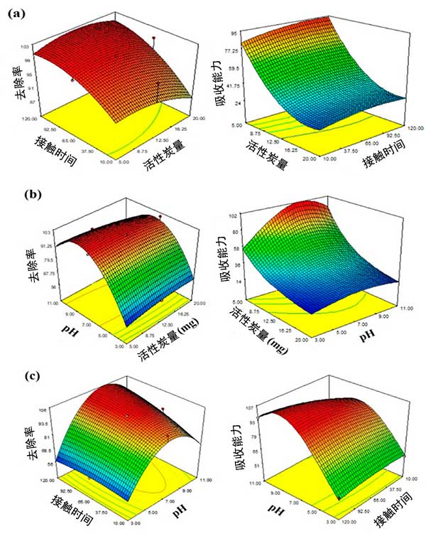 圖3:表面響應(yīng)圖吸附參數(shù)對去除和吸收能力的影響(a)活性炭劑量與接觸時(shí)間的相互作用;(b)活性炭與pH之間的相互作用;(c)相互作用pH值與接觸時(shí)間。