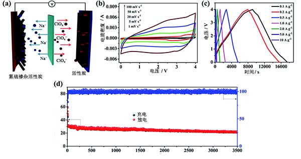 圖3:(a)活性炭制成的鈉離子電容器。(b)各種掃描速率的CV曲線。(c)基于活性炭陽(yáng)極陰極的總質(zhì)量,在不同電流密度下電容器的恒電流充電放電曲線。(d)活性炭電容器的循環(huán)性能。