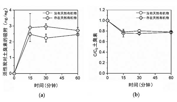 圖1:(a)吸附的土臭素的量和(b)在沒(méi)有和存在天然有機(jī)物質(zhì)的情況下活性炭上殘留的土臭素的比例。