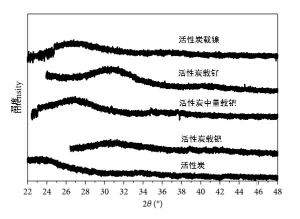活性炭載三種金屬的衍射圖如圖2所示。在該圖中,可以看出金屬樣品或活性炭沒有確定的信號(hào),這可能表明所有樣品中都沒有結(jié)晶相,或晶體非常小(<100)。不存在結(jié)晶是由于樣品的低金屬負(fù)載量低于X射線衍射設(shè)備的檢測(cè)極限的結(jié)果。