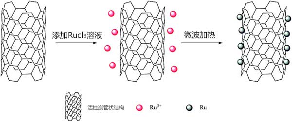 所有載釕活性炭上的釕負(fù)載量理論上為5%。通常,將活性炭加入120mL乙二醇中。并將混合物在超聲處理30分鐘以確保活性炭均勻分散。超聲處理后,在連續(xù)攪拌下滴加3.0mL RuCl 3水溶液30分鐘。然后是使用NaOH乙二醇溶液將混合物的pH調(diào)節(jié)至4.0。然后,在連續(xù)攪拌24小時后,將溶液放入微波合成反應(yīng)器中加熱100秒。過濾混合物溶液,用去離子水洗滌直至濾液的pH達到7.0,并在80℃下真空干燥。將樣品研磨成粉末使用。由于活性炭的表面是疏水的,它們傾向于在極性溶劑中聚集。并且由官能團改性的活性炭可以提供足夠的孔隙以使釕納米顆粒均勻地分布在活性炭的表面上。在通過微波加熱的多元醇方法制備活性炭負(fù)載的釕納米顆粒。合成過程如圖1所示。