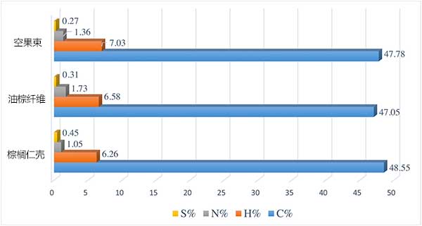 CHNS分析:在碳化和活化之前分析預(yù)處理活性炭的元素組成。圖4顯示了預(yù)處理樣品的定量元素分析的圖示。碳是所有樣品中最突出的元素,棕櫚仁殼,空果束和油棕纖維分別為48.55%,47.78%和47.05%。空果束含有7.03%的氫和1.36%的氮。油棕纖維含有6.58%的氫,1.73%的氮,而棕櫚仁殼含有6.26%的氫和1.05%的氮。對于所有活性炭樣品,硫含量不太重要,因為它們含量低于1%。