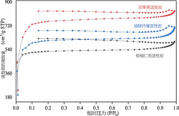 BET表面積和孔徑分布:所述吸附物在物理吸附過程中使用是氮氣。吸附和解吸等溫線用于估計每個活性炭的表面積和孔分布。圖5顯示了三種活性炭的等溫線圖。在低相對壓力下在所有樣品上觀察到開放式II型滯后曲線。據(jù)說,當前體碳化過程中不完全燃燒導(dǎo)致孔隙收縮時,這種開口性和低相對壓力下的低吸附性隨著相對壓力的增加而增加]。