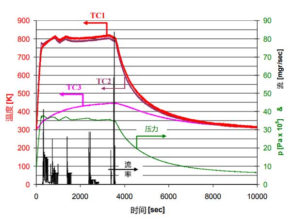 排出壓力約為3.5MPa的實(shí)驗(yàn)結(jié)果如圖4所示。250秒后,加熱功率為500W,中心溫度超過476℃,而電池底座溫度則為76℃。然而,將電池達(dá)到其穩(wěn)態(tài)溫度分布需要大約60分鐘,其中電池基座中的溫度為166℃;钚蕴康臏囟炔辉试S超過526℃。 60分鐘,加熱功率逐漸降低,以保持最高溫度低于526℃,壓力高于3.5MPa。由于電池基座的溫升速率隨時(shí)間降低,輸送的氮量也減少了。因此,在15分鐘后結(jié)束放電階段僅從活性炭吸附池釋放4.6g氮。圖4中的冷卻階段持續(xù)約100分鐘,并且如果放電階段在15分鐘后結(jié)束(此時(shí)基礎(chǔ)溫度僅為126℃),則可以減少冷卻階段;钚蕴恐械募訜岷屠鋮s速率以及溫度分布與數(shù)值分析估計(jì)的相似。這表明簡化的數(shù)值傳熱分析為吸附池中的傳熱提供了令人滿意的估計(jì)。