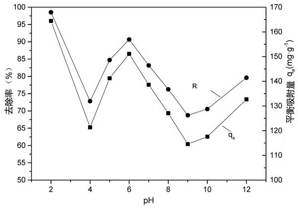 pH對活性炭吸附鉻黑T的影響:用3.00g·L-1活性炭懸浮于含有500mg·L-1鉻黑T的50mL溶液的8個燒杯中進行pH效應(yīng)實驗,pH設(shè)定為2.0-12.0。將混合物在25℃的溫度下在振蕩器上平衡48小時。吸附后,用孔徑為0.45μm的聚醚砜膜過濾混合物,測定鉻黑T水溶液濃度。根據(jù)結(jié)果,我們確定了合適的pH值。