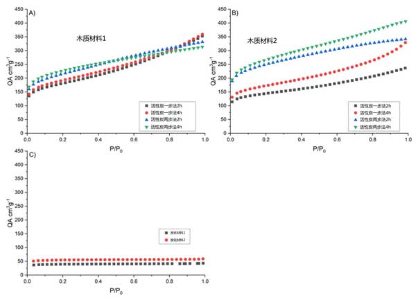 圖1:(A、B)兩種木質(zhì)材料的一階段和兩階段活化(C)原材料碳化的吸附等溫線(xiàn)。