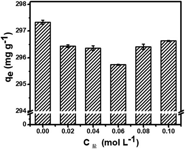 染料廢水含有各種鹽類和金屬離子,影響活性炭的吸附效率。在圖2中可以觀察到孔雀石綠對活性炭的吸附能力受鹽濃度的顯著影響。當NaCl濃度為0.02mol L-1時,吸附容量意外降低。然而,在將鹽濃度增加到0.10mol L-1的同時,這種負面影響將變得可以忽略不計。如上所述,靜電相互作用可能在吸附過程中起關(guān)鍵作用。