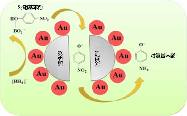 圖2:對(duì)硝基苯酚與對(duì)氨基苯酚與活性炭載金納米催化劑還原反應(yīng)的示意圖。