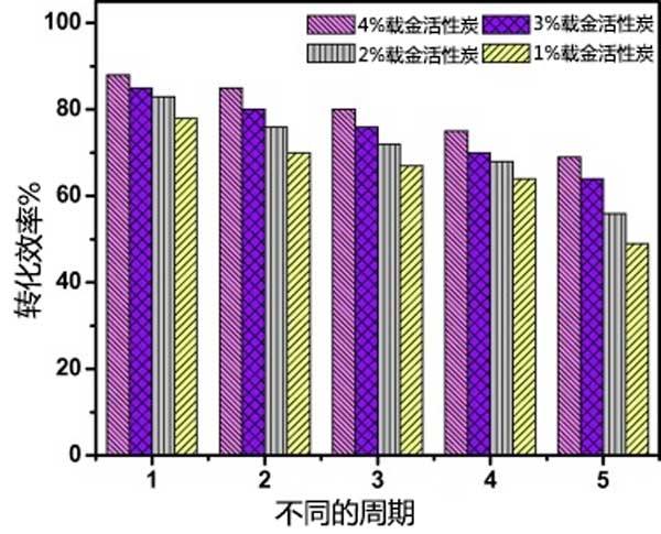 為了量化活性炭載金催化劑的催化活性,可以使用轉(zhuǎn)換頻率作為度量。轉(zhuǎn)換頻率可以定義為使用每克活性炭每單位時(shí)間轉(zhuǎn)化成產(chǎn)物(對(duì)氨基苯酚)的反應(yīng)物分子(對(duì)硝基苯酚)的數(shù)量;钚蕴枯d金催化劑是可回收的,每次運(yùn)行后,通過離心分離催化劑。即使使用5次,催化劑的轉(zhuǎn)化率最多降10%。這通過繪制百分比轉(zhuǎn)換效率與循環(huán)次數(shù)來顯示,如圖3示。