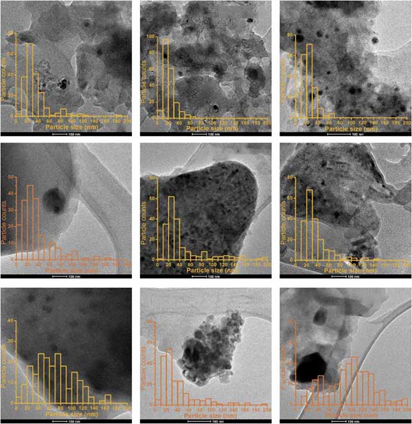 粒徑的變化在許多催化應用中是至關重要的,并且使用硝酸的原理正是為了誘導這些變化。為了通過實驗驗證該假設,對于所有九種載銠活性炭催化劑,通過TEM系統(tǒng)地評估Rh納米顆粒的粒度和分布。