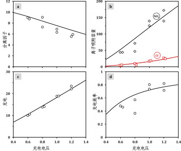 圖3a顯示了這一點分離因子隨充電電壓降低,但親和效應不會減少很多,并且在高電壓下也繼續(xù)發(fā)揮重要作用。充電和離子吸附容量隨充電電壓的增加而增加。圖3d顯示充電效率遠低于單位,這可以通過在充電步驟開始時從活性炭表面解吸共離子來解釋。
