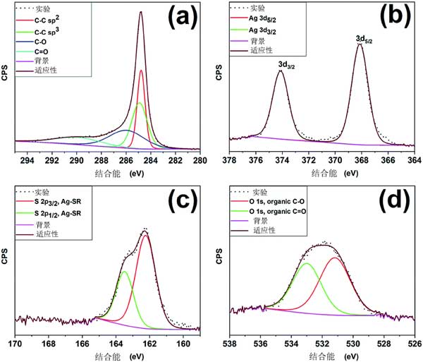 圖2顯示了所制備的活性炭樣品的組成元素的XPS光譜。XPS測量圖顯示碳,銀,硫和氧作為構成元素的存在。S 1p光譜配有多個高斯分量,這些物種通常存在于活性炭表面上。圖2(b)分別顯示了多個峰,它們與零價態(tài)的銀原子一致。S 2p光譜的高分辨率光譜的反卷積,如圖2(c)所示,顯示兩個自旋軌道分裂為〜1.2 eV的峰。O 1s光譜顯示出不對稱的曲線,表明活性炭表面存在多種氧物質(圖2d)。光譜的反卷積產生兩個,其可分別歸因于活性炭表面的C-O和C O物質,因此不存在金屬氧化物物質?傊,XPS結果表明硫醇鹽配體保持附著在銀簇表面的表面上,并且在活性炭樣品中不發(fā)生銀原子的氧化。