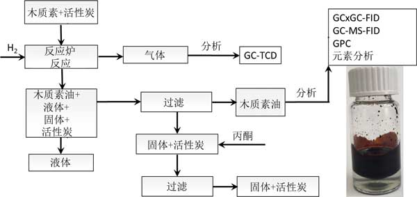 所有活性炭催化加氫處理反應均在間歇式高壓釜中進行。反應器被鋁塊包圍,該鋁塊包含電加熱元件和允許冷卻水流動的通道。使用氣體誘導的渦輪機機械攪拌反應器內(nèi)容物。在線監(jiān)測反應器中的溫度和壓力并記錄在電腦上。加氫處理和后處理程序示意性地顯示在圖1中。最初,向反應器中加入木質(zhì)素和活性炭催化劑。隨后,用氫氣沖洗反應器以排出空氣并在室溫下加壓至120巴以進行泄漏測試。泄漏測試后,壓力降至100巴。開始攪拌(1200rpm),并以約10℃每分鐘的加熱速率將反應器內(nèi)容物加熱至所需溫度(400-500℃)。當達到所需溫度時,將反應時間設定為零。反應完成后,將反應器以約10℃每分鐘的速率冷卻至室溫。記錄室溫下的壓力以確定反應過程中產(chǎn)生的氣相組分的量。將產(chǎn)生的氣體收集在氣袋中以確定組成。對于所有反應,觀察到兩個單獨的液相的清晰形成即即。產(chǎn)品處理程序如圖1所示。反應后,將有機相和水相通過微過濾器過濾并通過傾析分離。用丙酮徹底洗滌固體并干燥以確定固體產(chǎn)率。