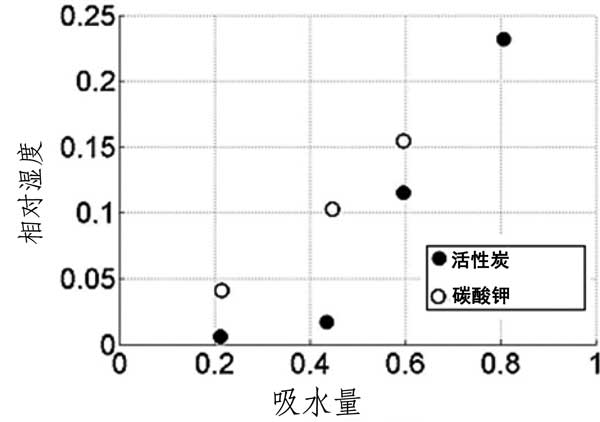 根據(jù)以前的測(cè)試結(jié)果,當(dāng)相對(duì)濕度在6至10%的范圍內(nèi)并且其在40%以上潮解時(shí),碳酸鉀在25℃開始水合。如圖2所示活性炭載體和吸附劑在40℃下的水吸附容量;钚蕴枯d體的吸收在相對(duì)濕度為60%下急劇增加,在相對(duì)濕度為80%下達(dá)到最大23%的重量增加。在那里,吸附劑的吸收量幾乎是載體的6倍,并且最重要的是,它遠(yuǎn)遠(yuǎn)高于理論上形成碳酸鉀倍半水合物所需的量。這種顯著差異的原因是鹽在約相對(duì)濕度為43%下潮解,因此所有過(guò)量的水在載體材料的孔中冷凝,產(chǎn)生鹽的水溶液。