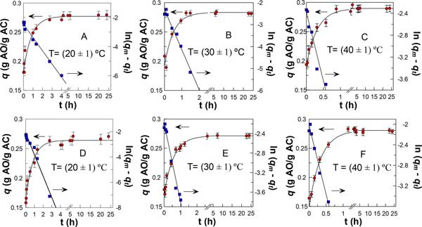 圖1顯示了典型的動力學圖,說明了沒食子酸和沒食子酸丙酯在平衡(q)時每質(zhì)量活性炭吸附的抗氧化劑的量隨時間的變化。還顯示了在不同溫度下至少三個半衰期(相關(guān)系數(shù)>0.99)的相應一階圖。在所有情況下,吸附曲線均顯示在4h后達到平衡,并至少維持24h,這是后續(xù)研究的時間。