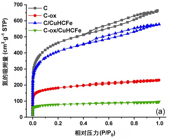 這些樣品的氮吸附等溫線和孔徑分布如圖3所示。。盡管活性炭和活性炭負載過渡金屬樣品的等溫線是I/IV型,結(jié)合了微孔和中孔性,但很難觀察到這些曲線的中孔部分,而活性炭負載過渡金屬樣品的等溫線幾乎消失了,說明了中孔性。該觀察結(jié)果與孔徑分布曲線一致,進一步顯示了孔徑和尺寸的減小。另外,我們注意到,在兩種情況下,過渡金屬銅相的引入均導(dǎo)致窄的孔徑分布。這可能表明活性炭孔中存在一些顆粒。多孔性的降低和氧官能團濃度的增加可能會影響銫的吸附性能。