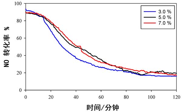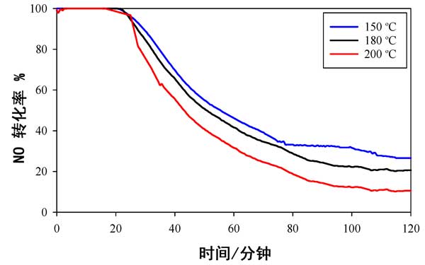 使用活性炭載錳氧化物催化劑時(shí),不同溫度下NO轉(zhuǎn)化率數(shù)據(jù)與時(shí)間的關(guān)系如圖2所示。它用于提供可以與以前發(fā)布的數(shù)據(jù)進(jìn)行比較的基線數(shù)據(jù)。在所有溫度(150°C,180°C和200°C)的前20分鐘內(nèi),幾乎有100%的NO轉(zhuǎn)化發(fā)生,但在此初始階段后NO轉(zhuǎn)化迅速下降,并且在2小時(shí)的測(cè)試后,轉(zhuǎn)化率不足20%。活性的溫度依從性依次為150°C>180°C>200°C。