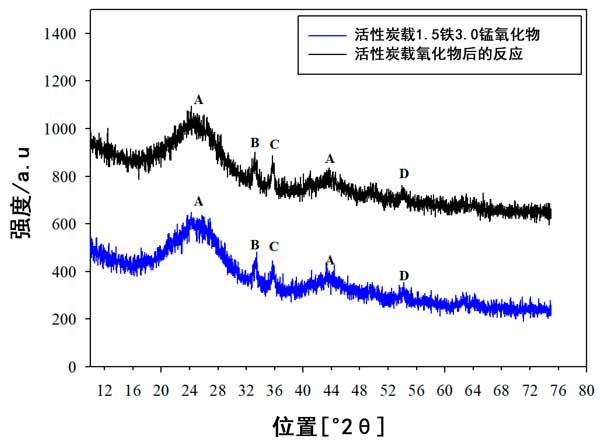 來自活性炭載鐵錳氧化物的XRD數(shù)據(jù)顯示在圖5中,其中已鑒定出主要峰。在2θ=24°和2θ=43°處的寬峰(標(biāo)記為A)與無定形碳的峰一致。它們的位置和寬度在新鮮和經(jīng)過測(cè)試的催化劑中都相同,這表明活性炭無定形結(jié)構(gòu)的穩(wěn)定性。在新鮮催化劑和測(cè)試催化劑中,在2θ=33.5°,2θ=35.1°和2θ=54.3°處分別出現(xiàn)了另外三個(gè)峰(分別標(biāo)記為B,C和D),并且位置或峰強(qiáng)度沒有明顯變化作為反應(yīng)測(cè)試的結(jié)果。2θ=33.5°(峰標(biāo)記為B)處的峰歸因于Fe 2 O 3 和在2θ=35.1°和54.3°的峰歸因于Fe 3 Mn 3 O 8,盡管在新鮮和測(cè)試的催化劑中這些與鐵有關(guān)的峰的強(qiáng)度和寬度相同,但是由于XRD峰較弱,因此很難確定在測(cè)試過程中鐵和錳的結(jié)晶度是否發(fā)生了變化。然而,結(jié)合的鐵氧化物與錳氧化物確實(shí)原因形成Fe 3的Mn 3 ö 8固體溶液,其可在的活性炭載鐵錳氧化物催化劑的NO轉(zhuǎn)化。