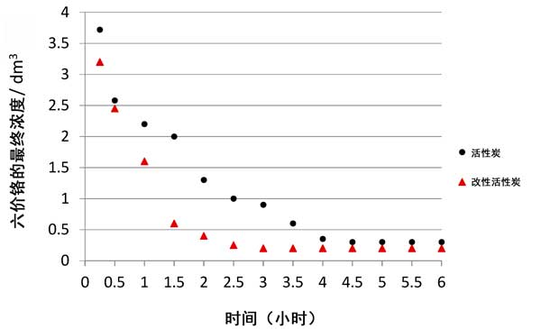從獲得的測(cè)試結(jié)果可以得出結(jié)論,吸附時(shí)間對(duì)特定碳的鉻(VI)去除效率具有顯著影響。鉻酸根離子相對(duì)于活性炭的最大還原發(fā)生在4.5小時(shí)后。在硝酸改性活性炭上去除鉻的速率更高,并且在2.5 h后發(fā)生了吸附平衡時(shí)間。然后進(jìn)行穩(wěn)定化處理,并進(jìn)行進(jìn)一步測(cè)試(確定等溫線),發(fā)現(xiàn)該接觸時(shí)間為不同的活性炭通常不超過(guò)6小時(shí)。