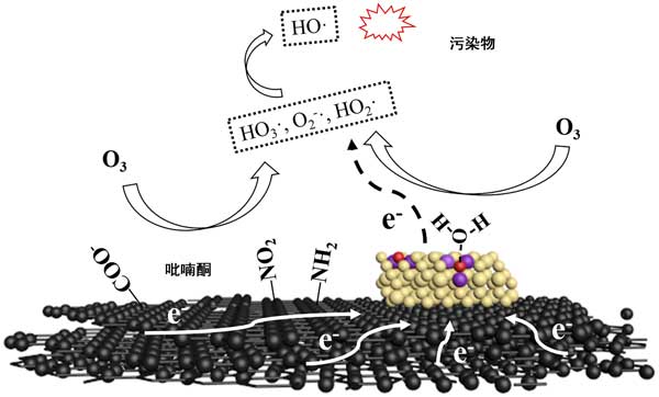 負(fù)載鈰的活性炭在臭氧氧化中可以很好的去除有機(jī)物,這主要是由于其各種去除機(jī)理,包括吸附,臭氧氧化和自由基氧化。吸附和臭氧化都是選擇性的。一些有機(jī)物在活性炭上緩慢吸附,因此非選擇性的羥基自由基氧化對(duì)于通過(guò)負(fù)載鈰的活性炭催化的臭氧氧化作用從水中去除難處理的有機(jī)化合物起著重要的作用。催化臭氧化系統(tǒng)中生成·OH的可能機(jī)理如圖3所示。通過(guò)這種機(jī)制,不僅可以通過(guò)表面官能團(tuán)而且可以通過(guò)負(fù)載在活性炭上的鈰來(lái)刺激·OH的生成。由表面基團(tuán)的自由基激發(fā)依靠其堿度和給電子效應(yīng)。對(duì)于負(fù)載在活性炭上的鈰,氧化鈰表面的氧空位是催化活性位。ø 3可以具有氧空位或直接用H反應(yīng)2 ö將其吸附在氧空位,以產(chǎn)生HO 3·,·O2 2-,HO 2·等自由基。這些自由基可以通過(guò)一系列鏈反應(yīng)轉(zhuǎn)化為·OH。在自由基生成過(guò)程中,氧空位周圍的Ce 3+會(huì)失去電子,并被氧化為Ce 4+,這可能導(dǎo)致催化活性降低。因此,富電子結(jié)構(gòu)(例如石墨烯層,-NO 2和吡喃酮)與氧化鈰之間可能發(fā)生電子轉(zhuǎn)移過(guò)程,從而導(dǎo)致Ce 4+的還原和催化活性的更新。這種協(xié)同效應(yīng)可能是在負(fù)載鈰的活性炭表面快速連續(xù)產(chǎn)生·OH的關(guān)鍵。