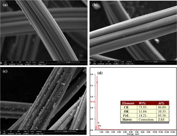 圖2示出了原始活性炭纖維的SEM圖像,并將其顯示,活性炭的表面有凹槽和平滑的整體,其中有幾個裂縫和小斑點(圖2的B)。HNO的表面形貌和鐵改性活性炭變?yōu)榇植?圖2c)和表面覆蓋由絮狀直徑在約數(shù)百納米的。如圖2d所示,EDX分析表明主要元素為C,O和Fe。觀察到在活性炭表面上載有一層約20-80nm的鐵納米顆粒。