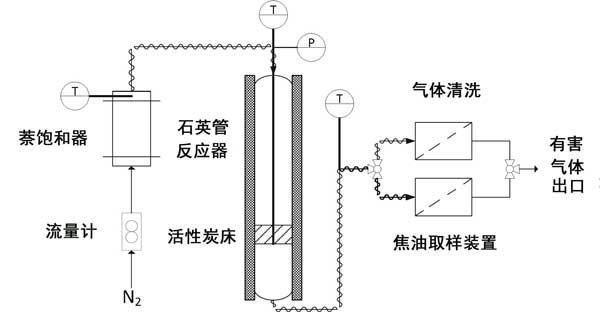 萘轉(zhuǎn)化試驗(yàn)已在圖1所示的實(shí)驗(yàn)設(shè)備中進(jìn)行,該設(shè)備顯示了其主要部分:進(jìn)料系統(tǒng),反應(yīng)器,采樣/清潔裝置和氣體分析儀。進(jìn)料系統(tǒng)由用于調(diào)節(jié)氮?dú)饬髁康霓D(zhuǎn)子流量計(jì)和萘飽和器組成,以獲取摻有焦油的物流。飽和器和反應(yīng)器之間的管道應(yīng)保持在150°C以上,以免萘發(fā)生冷凝。所使用的反應(yīng)器是內(nèi)徑為14 mm,總高度為600 mm的立式管狀石英反應(yīng)器。將活性炭床放在反應(yīng)器內(nèi)部的玻璃粉上方,該玻璃粉位于距頂部430毫米處。床的溫度通過(guò)K型熱電偶在床的中央進(jìn)行測(cè)定。在焦油采樣期間,通過(guò)切換三通閥,將反應(yīng)器出口處的氣體導(dǎo)入采樣裝置,并在其余時(shí)間內(nèi)導(dǎo)入清潔裝置。采樣裝置由三個(gè)撞擊器組成,在0°C時(shí)充滿異丙醇。專用實(shí)驗(yàn)表明,在本研究分析的條件下,該設(shè)備的捕獲效率超過(guò)99%。借助帶有熱導(dǎo)檢測(cè)器(TCD)的微型氣相色譜儀分析清潔區(qū)出口處的氣體,以在線測(cè)定短鏈烴(從乙炔到苯)和分子氫。實(shí)驗(yàn)裝置的更多詳細(xì)信息可以在其他地方找到。