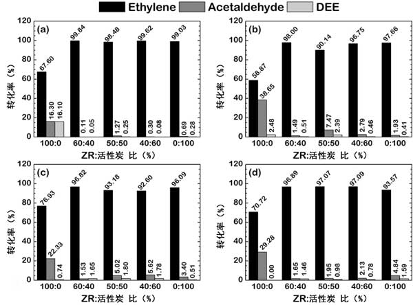 因此,提到在包含高達50wt%的活性炭的雙載體體系中發(fā)現的乙烯回收率的提高是由于來自活性炭的碳原子對催化劑的電子作用。另外,由于通過焦化的失活,大量的活性炭將導致乙烯回收率的降低,這是在高溫下與含碳反應物的反應中發(fā)現的常見的失活方案。這種失活導致活性位點的阻塞,降低了活性位點的數量,導致催化劑的總轉化率降低。