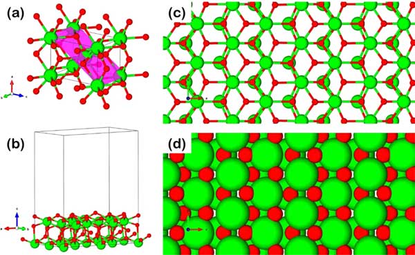 圖3:氧化鋯呈四方形結構,具有(a)高亮表面,(b)真空度為10Å的平板模型,球棒表面的俯視圖,(c)和空間填充視圖,(d)綠色和紅色原子分別是Zr和O。