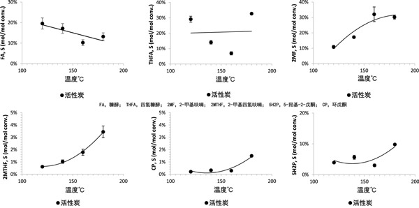 由于使用活性炭整料進行糠醛連續(xù)氫化以合成糠醇,四氫糠醇和環(huán)戊酮的工作很少,我們希望確定溫度和壓力對選擇性和時空產率或轉化率的影響。因此,在一組實驗中,采用活性炭催化劑來確定溫度對糠醛氫化的影響。在所有溫度下,活性炭整料的糠醛轉化率均高于90%;钚蕴空系母咛挤忾]率是在180°C時達到的(約90%)。升高溫度會降低糠醇的選擇性,并提高除四氫糠醇以外的所有產品的選擇性(圖2)。