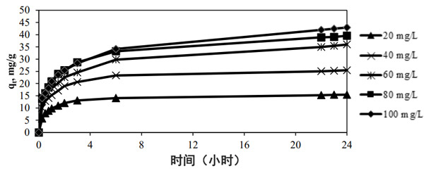 圖2說明了甲基黃初始濃度和接觸時間對30°C時吸附平衡的影響。隨著初始染料濃度從20 mg/L增加到100 mg/L,發(fā)現(xiàn)平衡時的染料吸附量增加。這些表明初始濃度提供了必要的驅(qū)動力,以克服對染料分子在水相和固相之間傳質(zhì)的阻力。初始濃度越高,濃度梯度的驅(qū)動力越大。從圖中可以看出,較高的初始濃度的染料溶液需要更長的接觸時間才能達到平衡。初始濃度為20-40 mg/L的染料溶液達到平衡所需的接觸時間約為3-5小時。