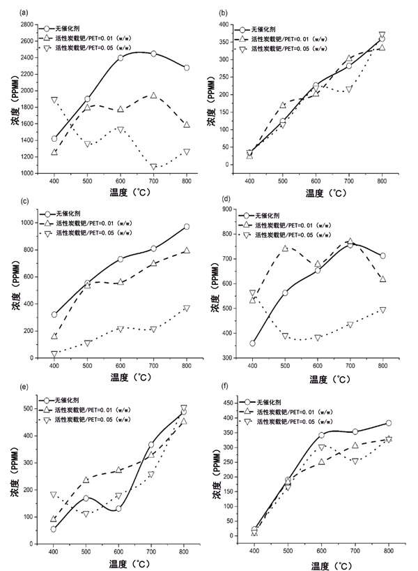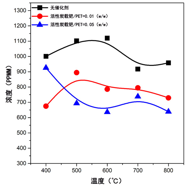 活性炭載鈀催化劑的高表面積歸因于活性炭載體。盡管金屬負(fù)載量為5 wt%,高表面積仍可實(shí)現(xiàn)高鈀分散度(42%)。已知活性炭具有很高的熱穩(wěn)定性,因此在熱解過(guò)程中大部分保留了活性炭的孔隙率。圖1顯示了在有和沒(méi)有鈀催化劑的情況下,由PET熱解獲得的多環(huán)烴和聯(lián)苯衍生物的濃度比較。使用不同的活性炭載鈀催化劑/PET比確定熱解過(guò)程中催化劑的作用。隨著熱解溫度的升高,三種類型的多環(huán)烴(2-萘甲酸,芴酮和三亞苯基)的濃度增加,這是因?yàn)榄h(huán)化反應(yīng)在較高溫度下更有利地形成了苯環(huán)。