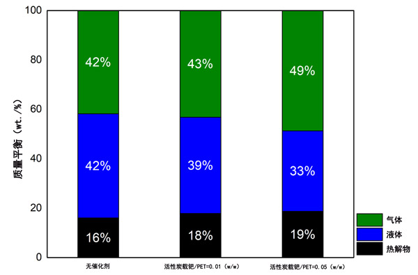 圖3:比較在800°C下有活性炭載鈀催化劑和沒(méi)有催化劑的情況下PET熱解的質(zhì)量平衡。