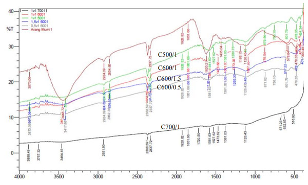 對于峰的強度,活化溫度在降低強度中起重要作用。較高的溫度將產(chǎn)生具有較少官能團的活性炭。最高活化溫度樣品顯示幾乎平坦的光譜。同時,對于活化劑定量,效果很小。比率從0.5增加到1.5似乎對樣品的化學性質(zhì)沒有任何影響,因為三個光譜相似。