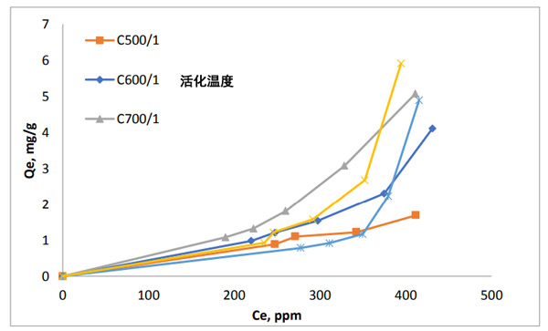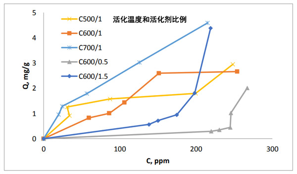 從圖2中可以看出,活性炭在不同的活化溫度(500℃,600℃和700℃)和活化劑比率(0.5、1.0和1.5)下的鋰吸附等溫線。似乎在較低濃度下吸附能力相對較低。這表明鋰離子對活性炭表面的親和力低。高濃度下容量的增加與孔隙率成正相關;钚蕴康妮^大表面積傾向于更多地吸附鋰離子。在等溫線的分類中,該等溫線被認為是III型等溫線,對于無孔或大孔吸附劑來說是典型的。因此,鋰離子似乎不附著在微孔內(nèi)部,而是附著在外部和大孔表面;钚蕴繉︿囯x子的親和力低。炭表面的碳原子與溶液中的鋰離子之間的低相互作用可能是由于離子的原子質(zhì)量低所致。原子間勢相互作用表明該力與相互作用原子的原子質(zhì)量以及原子之間的距離具有正相關。